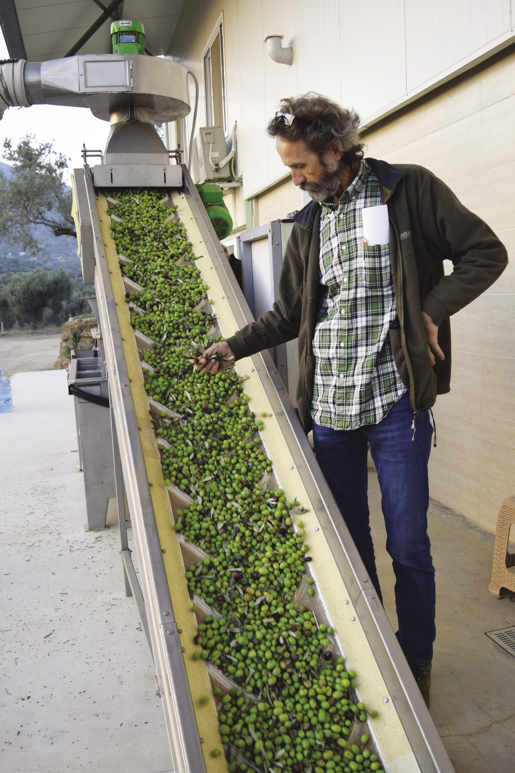 Bant yukarı doğru çalışmaya başlıyor. Zeytinler dökülüyor, banttan tırnaklara takılarak yukarı çıkıyorlar. Düzenli bir akış sağlanıyor. O sırada üflenen hava ile kalan yapraklar, toprak, böcekler uçuşuyor ve sadece zeytin taneleri kalıyor. Yıkama ünitesinden geçerken tazyikli bir su veriliyor, zeytinler yıkanıyor. Suyun her seferinde değiştirilmesi gerekiyor. Yıkanan zeytinler bir kafesten geçerek içeriye yani kırıcıya geçiyorlar.