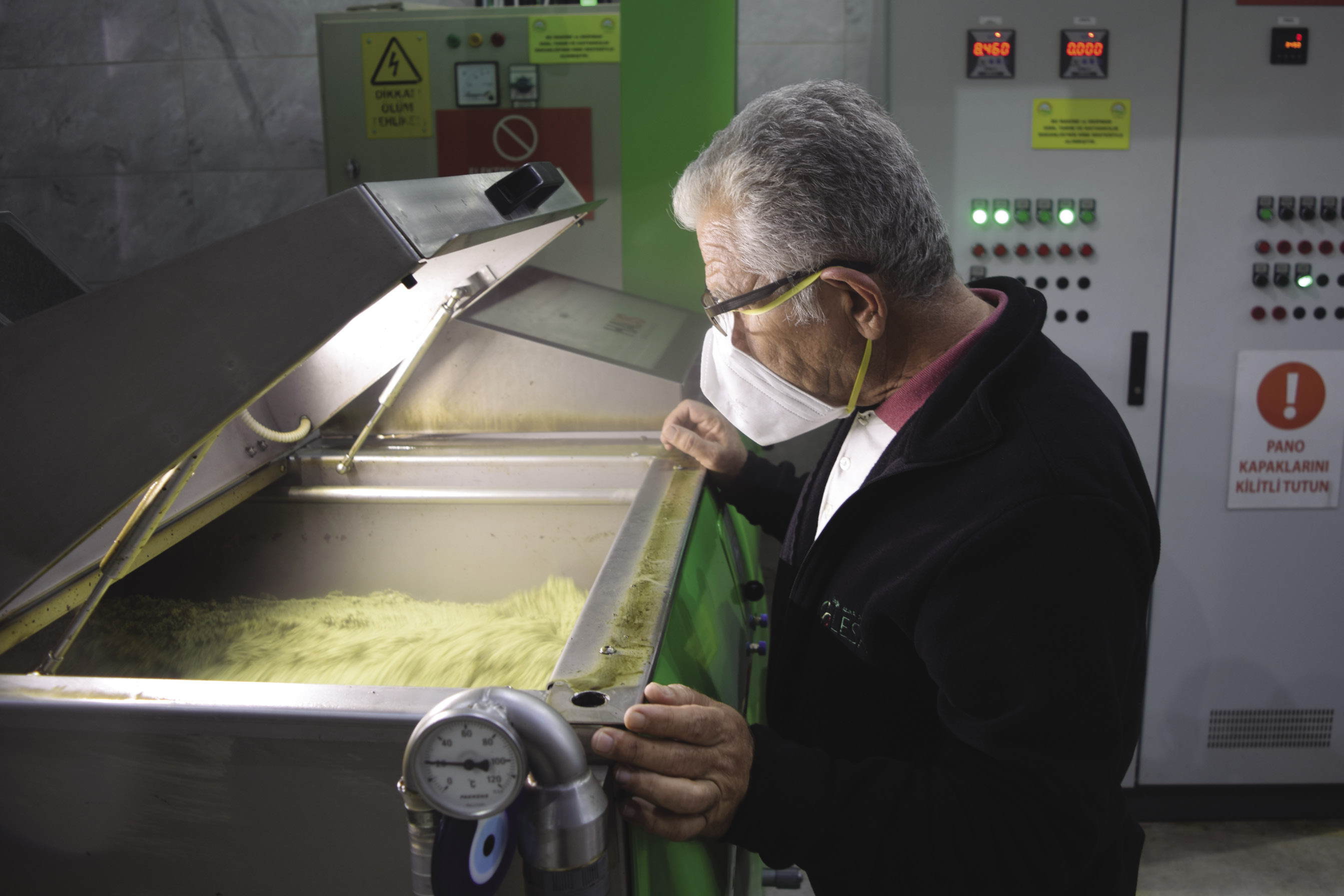Soğuk sıkım daha sağlıklı denir ya hep, bakın neden: “Polifenol dediğimiz yani zeytinin şifasını veren maddeler ve aromatik özellikli maddeler zeytinin yaklaşık yüzde 2’sini oluşturur ve genelde uçucu maddelerdir. Eğer zeytini havaya ve sıcağa maruz bırakarak sıkar ve saklarsanız bunlar uçup gidiyor. Mümkün olduğu kadar soğuk ve kontinü sistemle sıkıyoruz bu yüzden. Çıkan yağı tanklarda, oksijen teması olmadan soğuk ortamda saklıyoruz. Soğuk sıkımda yani 27 derecenin altında, tercihen 19-24 derece arasında yeşil bir meyveden sekizde bir, onda bir, bazen daha düşük verim alabiliyorsunuz. Yani 8-9 kilo zeytinden bir kilo yağ alıyorsunuz ortalama. Bunu 40 derecede işlerseniz faydalı maddeleri kaybediyorsunuz ama iki katı yağ elde edebiliyorsunuz. Dörtte bire, beşte bire yükseliyor. Yani başka etkenler de rol oynamakla birlikte verim en çok sıcaklıkla doğru orantılı. Zeytinyağının en büyük düşmanları oksijen, ışık ve sıcaklık. Bu üçünden koruyarak sofraya kadar getirmek tüm çabamız.”