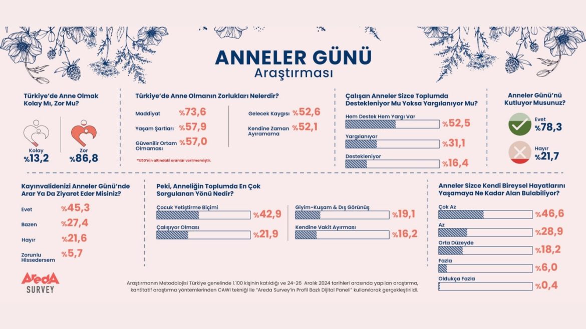 Areda Survey’in 05-08 Mayıs 2025 tarihleri arasında, 1.100 kişinin katılımıyla gerçekleştirdiği araştırmaya göre, katılımcıların büyük bir çoğunluğu Türkiye’de anne olmanın kolay olmadığını düşünüyor. Katılımcıların yalnızca yüzde 13,2’si anne olmanın kolay olduğunu belirtirken, yüzde 86,8’i bunun oldukça zor olduğunu belirtiyor.