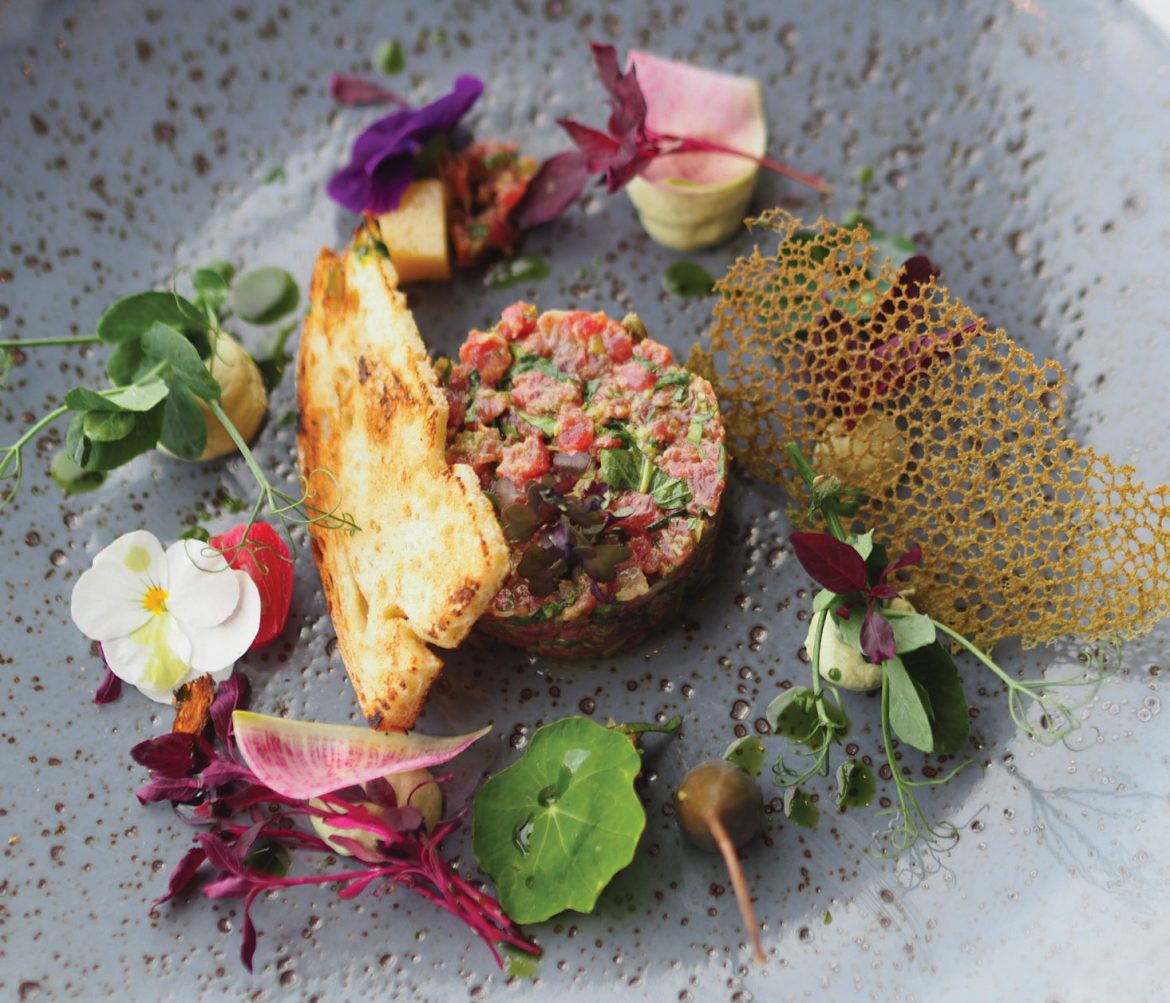 Başlangıçlardan biftek tartar hardallı avokado köpüğü, kızarmış köy ekmeği ile geliyor. Tabak, yemek için bozmaya kıyamayacağınız kadar özenle hazırlanmış. Fiyatı 43 TL. Ara sıcaklardan, Trakya kuzu ciğer külbastı bademli humus, kuzu kulağı, ev yapımı turşu ile servis ediliyor, fiyatı 44 TL. Gelelim ana yemek Topaz dana kaburgaya… Terbiyeli misket füme buğday Konya Bozkır’dan, dana eti ise Çanakkale Biga’dan. Dışı mühürlenen kaburganın tüm lezzetinin içinde kalması sağlanıyor. Sonra 12 saat ağır ateşte pişiyor. Üzerinde ise tarçın, elma, balzamik sirke ile kaynatılıp tereyağı ile bağlanan ve 48 saat kaynatılan oryantal glase sos bulunuyor. Mevsim kök sebzeler ile servis ediliyor. Lezzeti inanılmaz, fiyatı 78 TL.