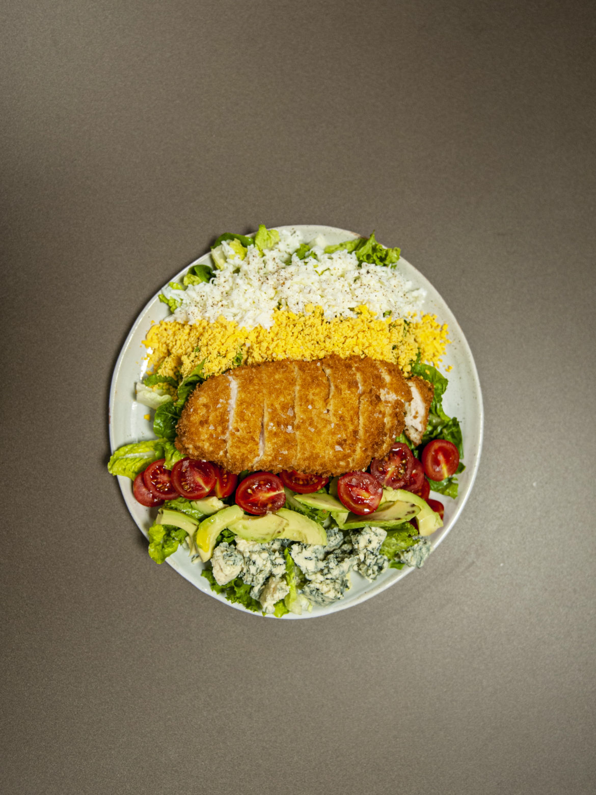 Limon suyu, zeytinyağı, tuz ve karabiberi çırparak salata sosunu hazırlayın. Tavuk göğsünü önce un, ardından çırpılmış yumurta ve en son ekmek kırıntısına bulayıp ayçiçek yağında her iki yüzü de altın sarısı renk alıncaya kadar kızartın. Daha sonra, 190°C fırında iç ısısı 75°C olana kadar pişirin. Yumurtaları haşlayın, beyaz ve sarısını ayırarak rendeleyin. Servis edeceğiniz tabağa iri parçalanmış ve soslanmış yeşillikleri aktarın. Üzerine rende yumurta sarısı ve beyazını, dilimlediğiniz çıtır tavukları, çeri domatesleri, avokado ve rokfor peynirini yerleştirerek servis edin.