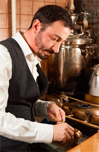 Can Özmen, Türk kahvesini pirinç cezvede pişiriyor.