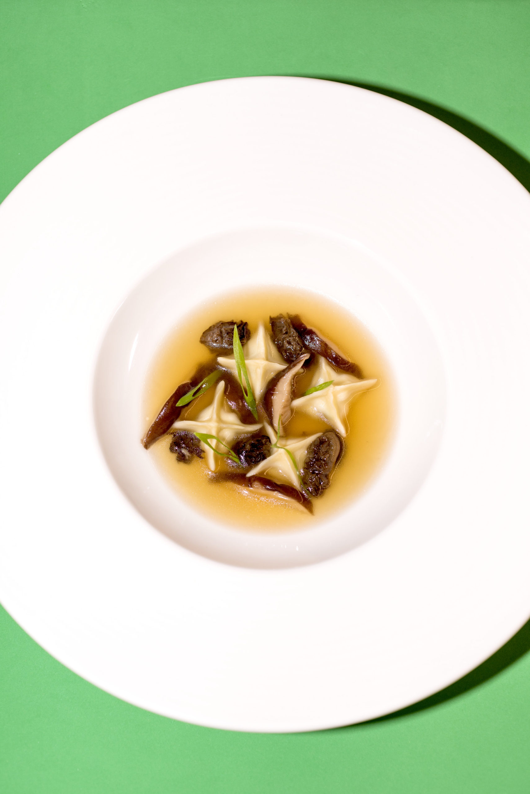 Levrek filetoları çok küçük küpler halinde doğrayın. Taze soğanları ince ince dilimleyin. Lime veya limon suyunu sıkın. Tuz ve karabiber ekleyerek tüm malzemeyi karıştırarak iç dolgunuzu elde edin. Hamuru 3-4 mm (mantı hamuru kalınlığında) açın. İstenen şekilde, kare veya yuvarlak kesip hazırladığınız dolgudan koyarak kapatın. Tuzlu suda ravioli’leri haşlayın ve çukur bir tabağa alın. Üzerine ısıttığınız consomme’yi koyun. Mantarlardan ilave edin ve en son taze soğanın yeşil kısımlarından ince dilimler keserek servis edin.