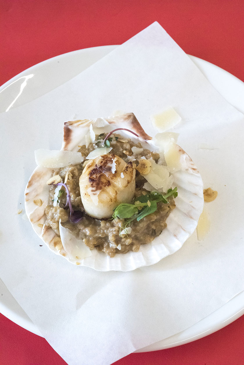 Kavılca bulgurunu bir süzgeç üzerinde yıkayıp kurulayın. Yağsız, yapışmaz bir tavada kısık ateşte, altın sarısı oluncaya kadar çevirerek kavurun (yaklaşık 10-12 dakika) ve kenara alın. Soğan ve sarımsakları orta ateşte, zeytinyağında yumuşayıncaya kadar pişirin. Beyaz şarabı ilave edin ve çektirin. Defne yaprağı ve kavılca bulgurunu ilave edin. 2-3 dakika karıştırarak pişirin ve bir kepçe tavuk suyu ilave edin. Ocağın başından ayrılmadan sürekli karıştırarak ve tavuk suyu çekildikçe her seferinde birer kepçe ilave ederek kavılca bulgurunu yaklaşık 14-16 dakika yumuşayıncaya kadar pişirin. Kavılca bulguru yumuşadıktan sonra tereyağı ve peyniri ilave edip karıştırın. Maydanoz ve tuz ilave edip kenara alın. Bu sırada deniz taraklarını tuz ile lezzetlendirin. Harlı ateşte az yağda her bir yüzeyini 2’şer dakika pişirin. Risottoyu tabaklara aktarın. Üzerine deniz taraklarını yerleştirip servis edin.