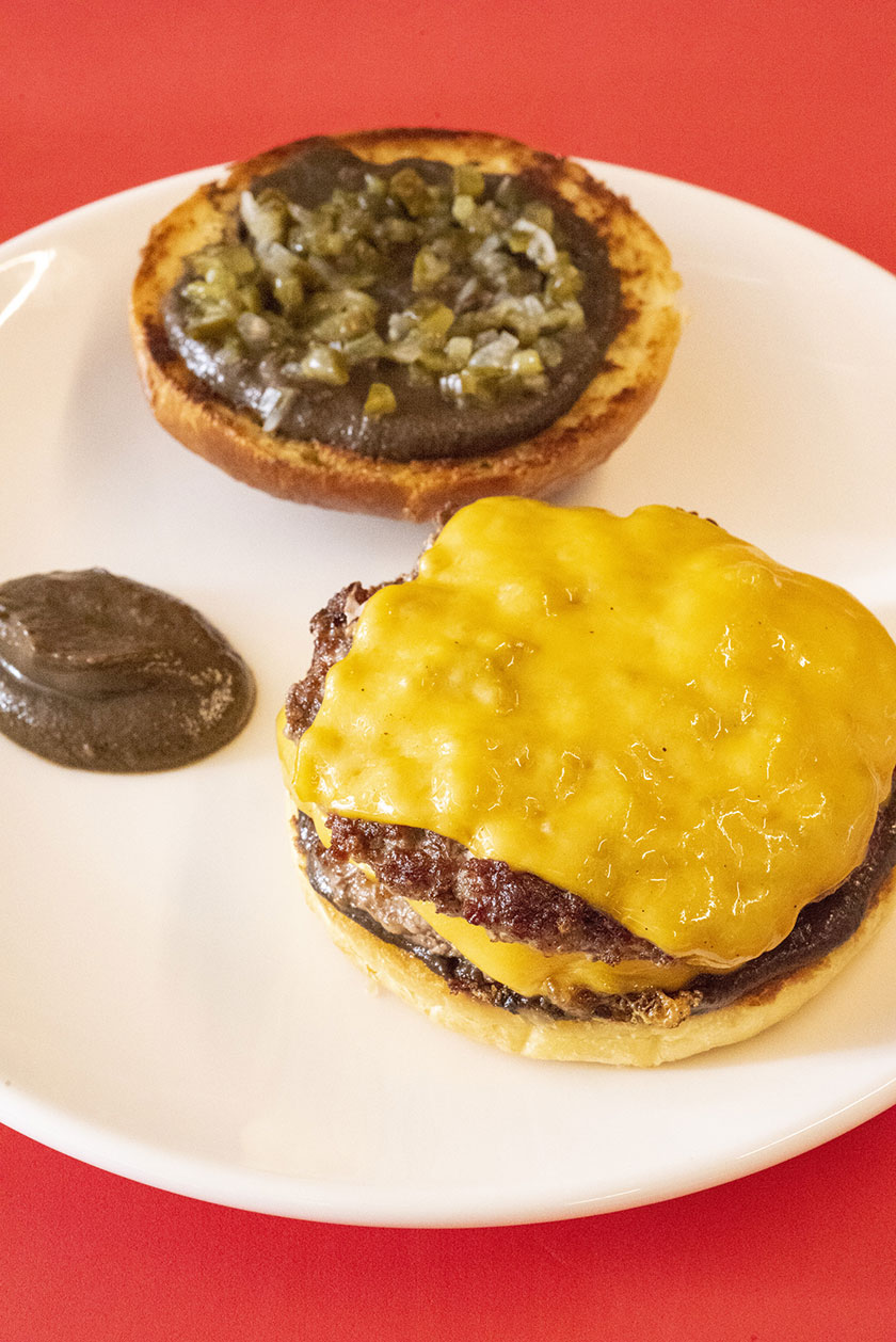 Burger ekmeklerinin iç kısımlarını tereyağı ile fırçalayın. Harlı ateşte, yağladığınız yüzeylerini kızartıp kenara alın. Burger etlerini tuz ile sezone etin. Harlı ateşte her bir yüzü 1’er dakika olacak şekilde pişirin. Köftelerin üzerine peynirleri yerleştirin ve hafif erimeye başladığında kenara alın. Ekmeklerin her iki yüzüne de mantar ketçap sürün. Alt tabanın ortasına relish’i yerleştirip, üzerine köfteleri koyun. Üst kapağı kapatın ve servis edin.