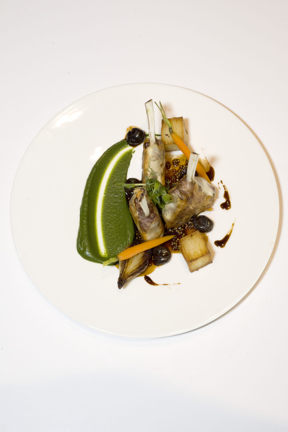 Pirzolalar, bir gün önceden mesir macunu, süt ve soğan rendesi ile masaj yapılarak marinasyon yapılır ve bekletilir. Ardından, macunu üzerlerinden sıyrılan pirzolalar, zeytinyağı ve taze baharatlar ile iki saat daha bekletilir. Pirzolalar, tavada mühürlenir ve ardından dilimleme makinesinde ince dilimlenen patateslere sarılır. Tavada altı ve üstü eşit şekilde kızartılarak 180 derecelik fırında 7 dakika pişirilir. Ispanak kremasını hazırlamak için öncelikle ıspanaklar kaynar suya atılır, buza çıkartılır ve süzdürülür. Ardından krema, tuz ve biber eklenerek blender’dan çekilir. Kereviz pave hazırlamak için tereyağı eritilerek sarımsak ve taze baharatlarla karıştırılır. Kerevizler soyulur, dilimleme makinesinde ince ince dilimlenir ve derin bir fırın kabına dizilir. Dilimlenen kerevizlerin her katına sarımsaklı tereyağı, tuz, biber ve rende parmesan eklenir. Folyo kâğıdıyla fırın kabının üzeri kapatılarak 165 derecelik fırında