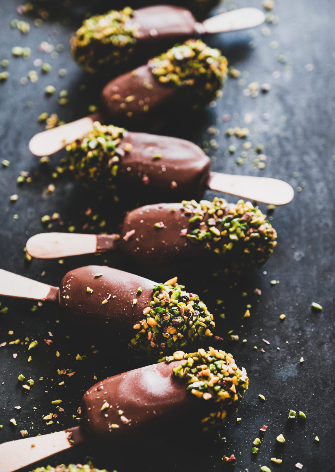 Dışını kaplamak için bitter çikolatayı benmari usulü eritin. Eriyen çikolataya hindistancevizi yağı veya tereyağı ekleyip karıştırın. Çikolata pürüzsüz bir kıvam alınca kalıplarda iyice donmuş olan dondurmaları çıkarıp çikolataya batırın. Her tarafı çikolatayla bulandıktan sonra yarısını Antep fıstığı ile kaplayıp tekrar dondurucuda 2-3 saat donmaya bırakıp servis edebilirsiniz.