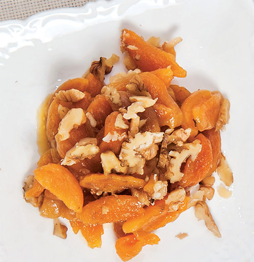 Yapılışı: Kuru kayısıları ortadan ikiye bölün ve orta boy bir tencereye alın. Üzerine şekeri ve suyu ekleyerek, kısık ateşte 10 dakika kayısılar yumuşayana kadar pişirin. Tereyağını ekleyerek, 5-6 dakika daha pişirin, ocaktan alın. Kayısılar hafifçe soğuduktan sonra, üzerine cevizleri serpiştirin ve ılık servis edin.