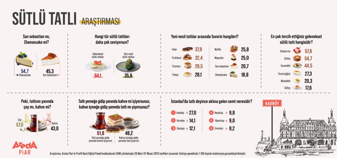 Areda Piar’ın 28 Mart-07 Nisan 2025 tarihleri arasında gerçekleştirdiği araştırmaya göre, Türkiye genelinde tatlı severlerin gönlünde hala geleneksel sütlü tatlılar tahtını koruyor. 1.100 kişiyle yapılan araştırmada, katılımcıların yüzde 64,1’i sütlaç, kazandibi, muhallebi gibi klasik tatlıları tercih ettiğini belirtirken; yüzde 35,9’u ise Magnolia, San Sebastian, Cheesecake gibi yeni nesil tatlıları sevdiğini ifade etti.