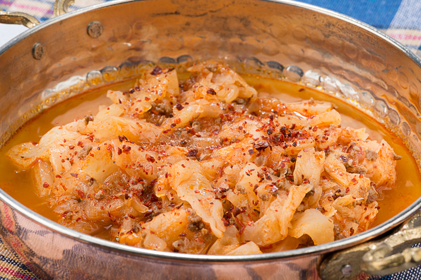 Soğanı soyup yemeklik doğrayın. Bir tencerede tereyağı ve sıvı yağı ısıtıp soğanı pembeleşinceye kadar kavurun. Salça ve kıymayı ekleyip kavurun. Doğranmış lahana, pul biber, karabiber ve tuzunu ekleyip kısık ateşte kendi suyuyla 20 dakika pişirin. 1-1,5 su bardağı sıcak su ekleyip 20 dakika daha pişirin. Üzerini pul biber ile süsleyerek servis yapın.