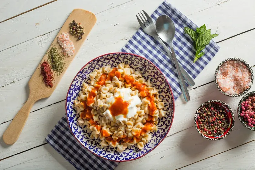 Unu derin bir kabın içine alıp ortasına yumurta, tuz ekleyin ve suyu azar azar ekleyip hafif sert bir hamur olacak şekilde iyice yoğurun. Yoğurduğunuz hamurun üzerini kapatıp 30 dakika dinlendirin. İç harcı için soğanları rendeleyip suyunu sıkın. Kıyma, karabiber ve tuzunu ekleyip iyice yoğurun. Dinlenen hamurdan küçük bezeler alın ve oklava yardımıyla ince bir şekilde açın. Açtığınız hamuru bıçak yardımıyla 2 cm büyüklüğünde kare kesin. Hazırladığınız harçtan hamurların içine bir miktar koyup hamurların uçlarını üst kısımda birleştirerek kapatın. Derin bir tencerede tereyağını eritip salça, tuz ve kırmızı toz biberi kavurun 2 litre su ekleyip kaynamaya bırakın. Kaynayan salçalı suda hazırladığınız mantıları haşlayıp süzün. Haşlanan mantıların üzerine sarımsaklı yoğurt gezdirin. Dilediğiniz gibi süsleyip servis yapın.