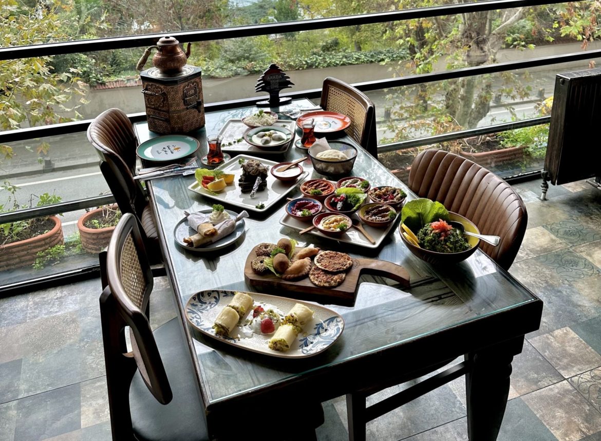 Menüde başlangıç olarak humus- patlıcanlı mütebbel- kabaklı mütebbel- pancarlı mütebbel- baba ganüş- muhammarah-zeytin yağlı sarma sunuluyor.  Salata tebbüle ya da fettüş olarak seçmeli.  Ara sıcaklarda kıymalı küçük pide, falafel, peynirli börek ve şavurma ve (tavuk dürüm) servis ediliyor. Ana yemek ve tatlı ise seçmeli olarak, sınırsız çay ve içecek eşliğinde sunuluyor.