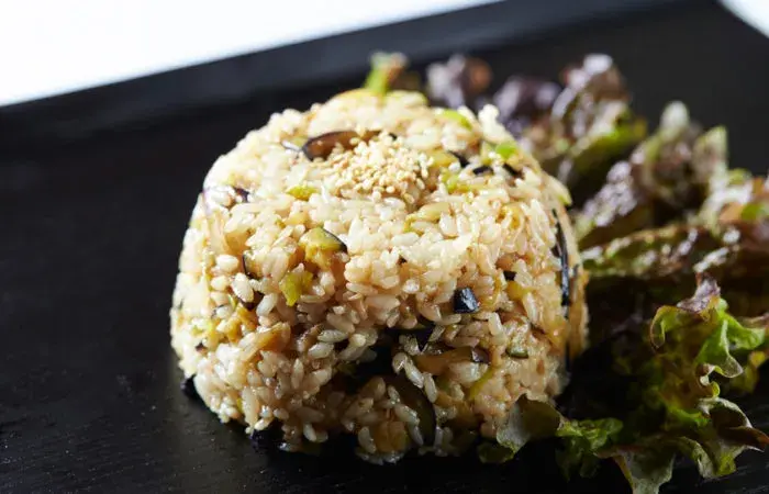 Pirinçleri bol suyla yıkayıp sıcak suda 30 dakika bekletin. Patlıcanları alacalı soyun ve küp küp doğrayıp tuzlu suda 30 dakika bekletin. Daha sonra sularını süzüp kızgın yağda patlıcanların pembeleşinceye kadar kızartın. Havlu kağıt üzerine alıp fazla yağını çektirin. Pilav tenceresinde tereyağını eritip rendelediğiniz soğanları ekleyip kavurun. Ardından pirinçleri ekleyin ve 4-5 dakika kavurun. Su, tuz, kızarttığınız patlıcanları ekleyip karıştırın ve orta ateşte pirinçler suyunu çekene kadar pişirin. 20 dakika dinlendirip servis yapın.