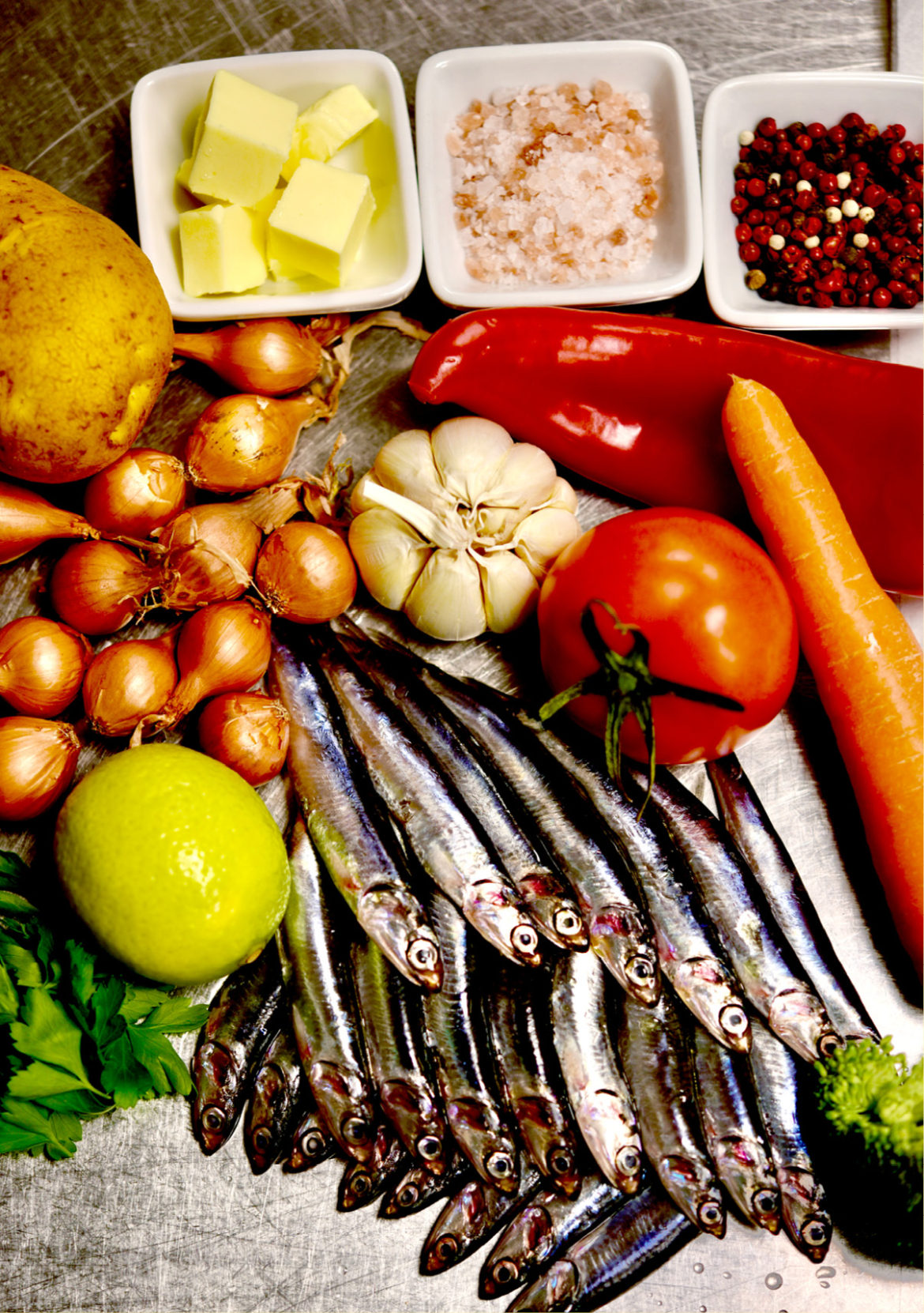 Arpacık soğan, havuç, patates ve brokoli tuzlu bir suda haşlanır. Hamsi temizlenir. Domates, kapya biber ve haşlanan sebzeler yarım ay şeklinde doğranıp yağlı kâğıda serilir. Temizlenmiş hamsiler sebzelerin üzerine dizilir. Balıkların üzerine limonlar yarım ay şeklinde dilimlenip yerleştirilir. Maydanoz, tuz ve karabiber serpiştirilir. Tereyağı eritilip üzerine dökülür. Biberiye ve defne yaprağı da eklenir. Son olarak üstü yağlı bir kâğıtla kapatılır ve önceden ısıtılmış 180-200 derecelik fırında 8 dakika pişirilir.