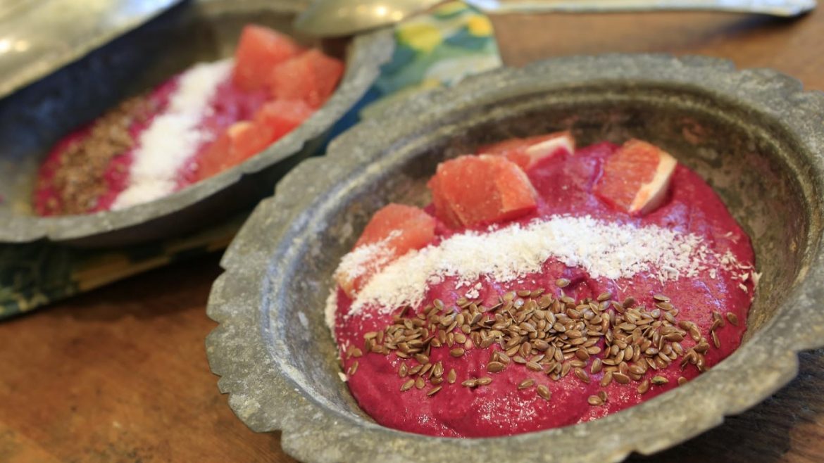 Malzemeler karışıp krema kıvamına geldiğinde servis tabaklarına aktarın. Üstünü keten tohumu ve hindistan cevizi tozunu ilave edin. Tabağının kenarlarını dilimlediğiniz greyfurtlarla ile süsleyin.