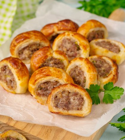 4. Bir tahtaya veya çalışma yüzeyine bir kare milföy hamuru koyun. Üstüne karışımdan ekleyin. Hamuru katlayarak rulo haline getirin ve sushi gibi 6-8 parçaya kesin.